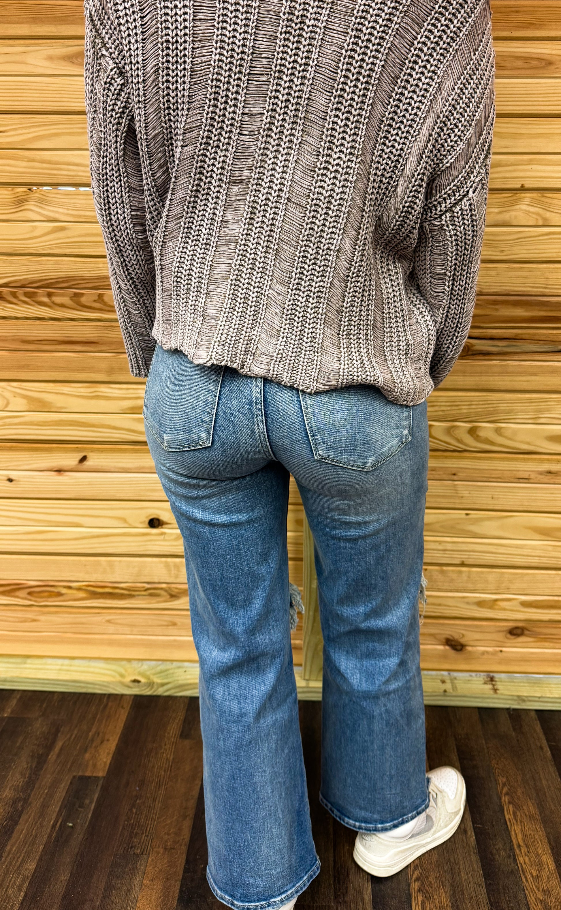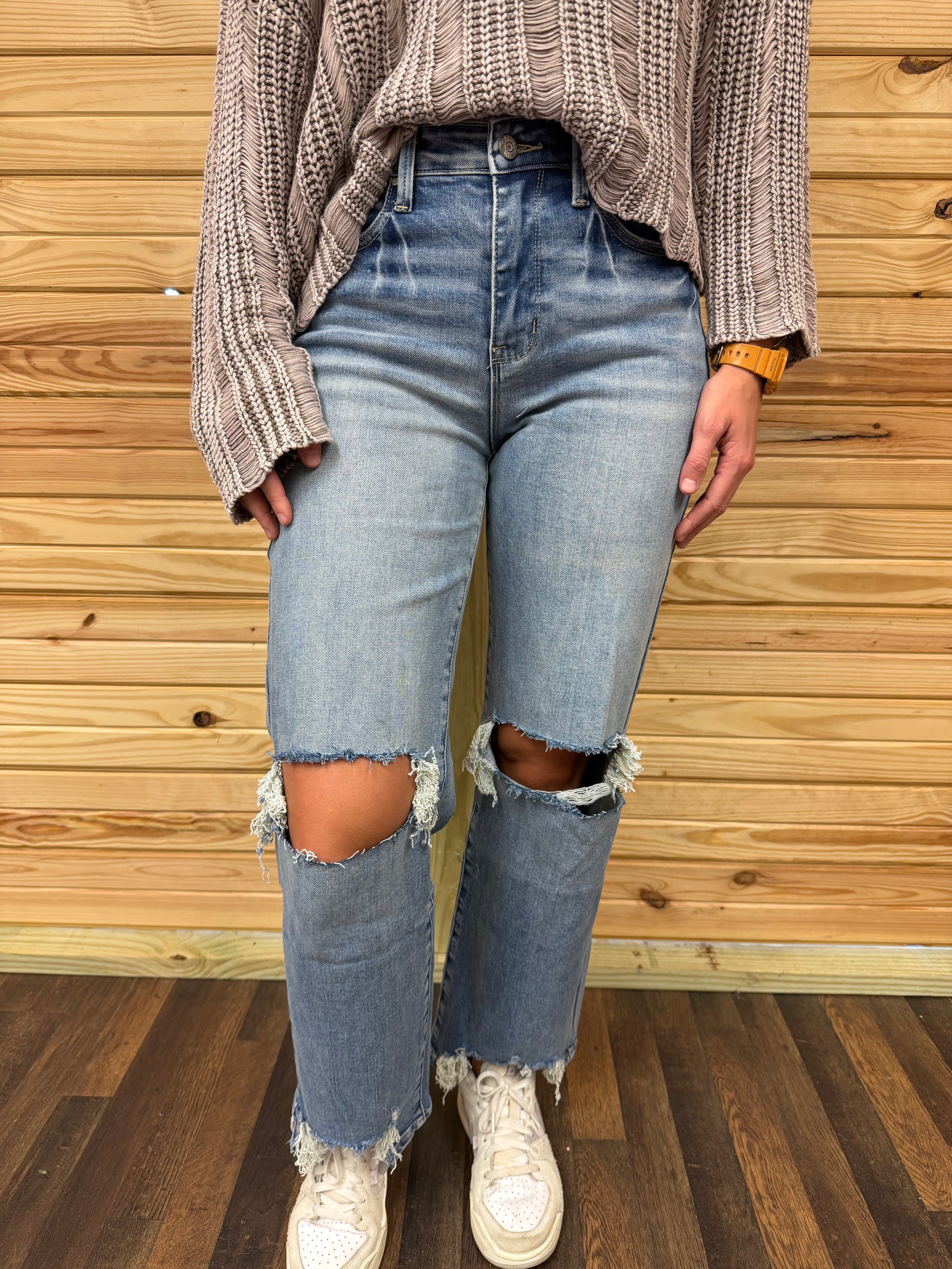 High Rise Stretch Slim Wide Leg Destroyed Hem